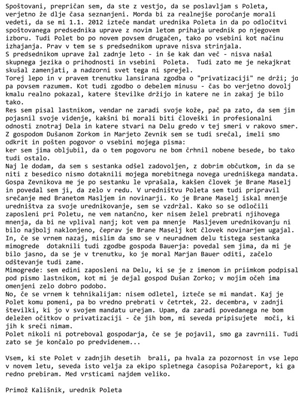 Pismo Primoža Kališnika, ki ga je novinarjem Dela in Slovenskih novic poslal po objavi našega članka. V pismu med drugim navaja, kako mu je takoj po odhodu Marjana Bauerja postalo jasno, da se je začelo odštevanje tudi zanj.