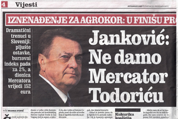 Jutarnji list je v članku o Mercatorju in Todoriću bivšega župana Ljubljane Jankovića razglasil za predsednika vlade, Žigi Debeljaku očital vlogo lastnika, Boža Jašoviča pa imenoval za poslednji glas razuma v Novi ljubljanski banki.