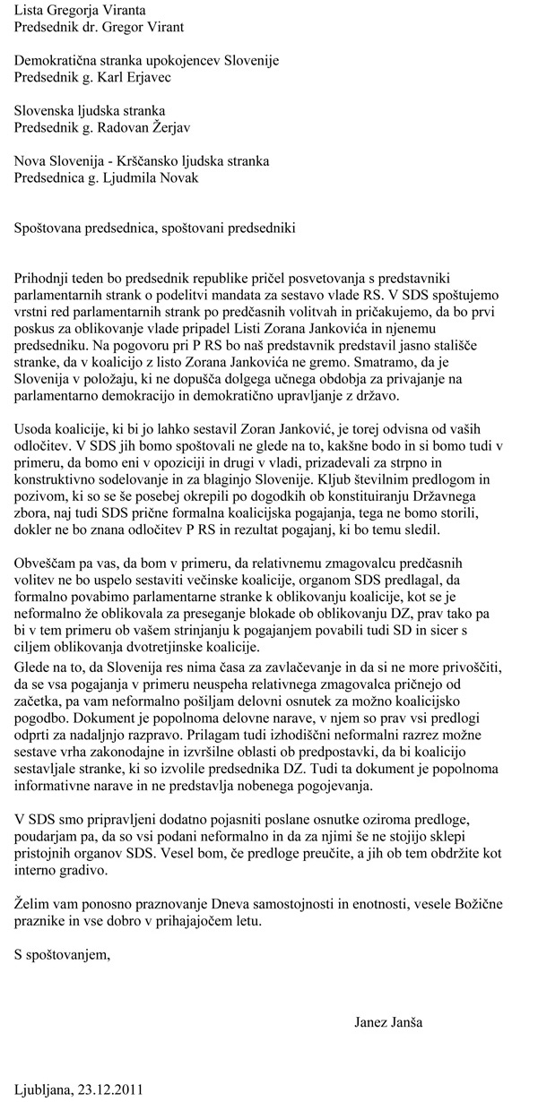Faksimile. Koalicijsko pismo Janeza Janše, ki ga je včeraj naslovil na Gregorja Viranta, Karla Erjavca, Radovana Žerjava in Ljudmilo Novak.