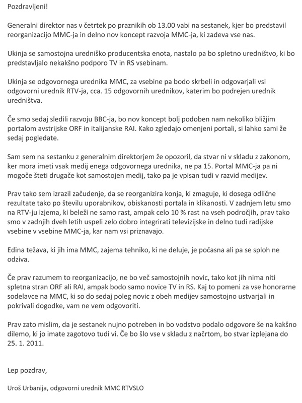 Pismo Uroša Urbanije sodelavcem MMC, kjer napoveduje organizacijske spremembe.