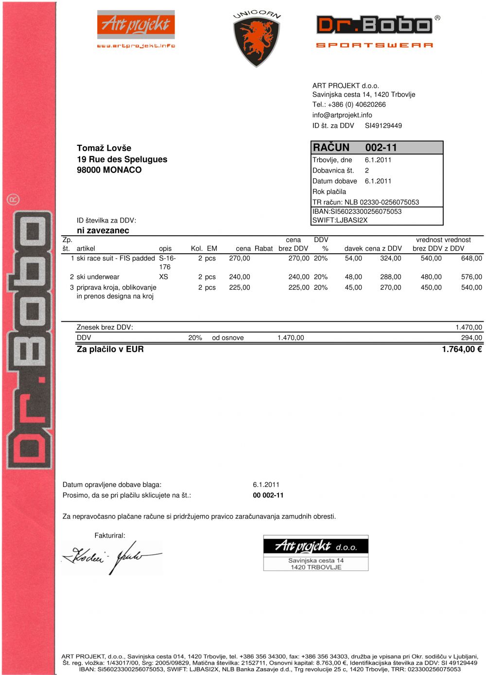 Faksimile računa za smučarsko opremo, ki jo je Lovše že pred novim letom podaril Alexandru Dibeliusu.