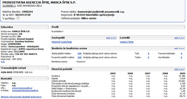 Podatki za Prireditveno agencijo Špik, Manca Špik s.p., povzeti po bazi podatkov Gvin (za povečavo klikni na sliko)