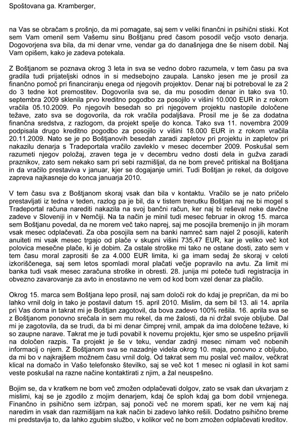 Pismo D.E. mami Boštjana Krambergerja, naj mu Boštjan vendarle vrne denar (1.del) ...