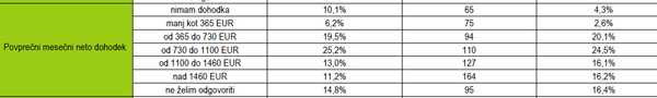 Tabela 1 (Povprečni mesečni osebni dohodek): prva kolona so spletni uprabniki, druga kolona indeks glede na uporabnike interneta, tretja kolona pa kaže odstotek prikazov. Vir: MOSS, december 2010