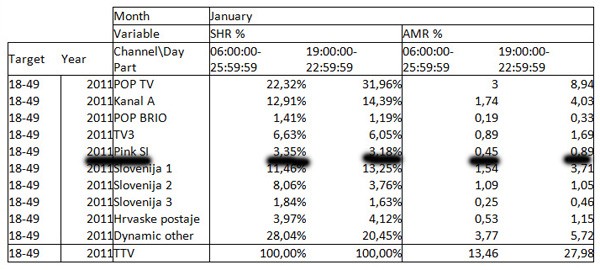 Tabela gledanosti: SHR pomeni delež, AMR pa rejting. Gre za dva časovna bloka, prime time od 19.00 do 23.00, in 6.00 do 24.00, kar velja za celodnevni blok. Pri podatkih za Pop Brio je treba upoštevati, da gre za kabelski program, ki ga sprejema le 60 odstotkov gospodinjstev.