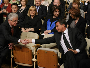 Stisk rok med premierom Borutom Pahorjem in predsednikom državnega zbora Pavletom Gantarjem. Zadaj tri ministrice, Majda Širca, Ljubica Jelušič in Darja Radić, še bolj zadaj pa nekaj poslank in poslancev Socialnih demokratov.