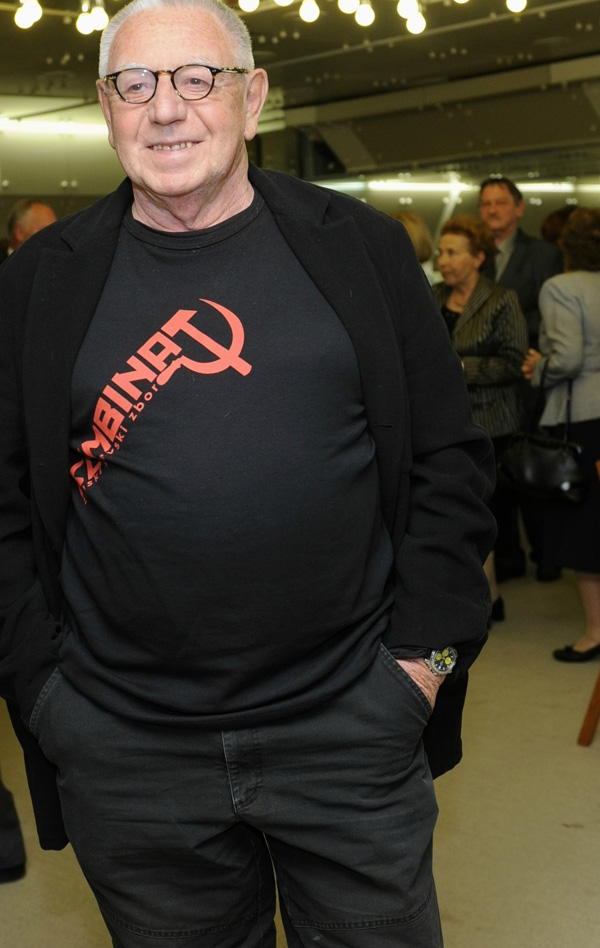 Režiser Dušan Jovanović v črni majici s srpom in kladivom.