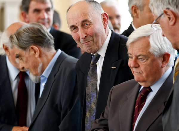 Na včerajšnjem precej okrnjenem sprejemu predsednika republike Danila Türka za ključne ljudi v času osamosvojitve (z leve proti desni): Janez Stanovnik, Ciril Zlobec, Ivan Oman, Milan Kučan in Pavel Gantar (za povečavo klikni na sliko).