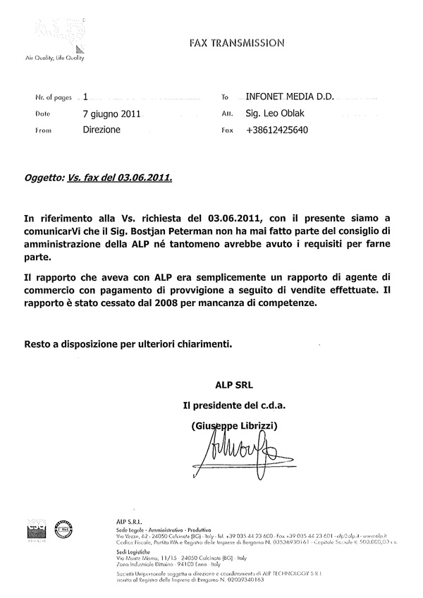 Direktor italijanske družbe ALP Giuseppe Librizzi je Oblaku pisno pojasnil, da Boštjan Peterman v tej firmi nikoli ni bil član uprave, niti zaposlen.