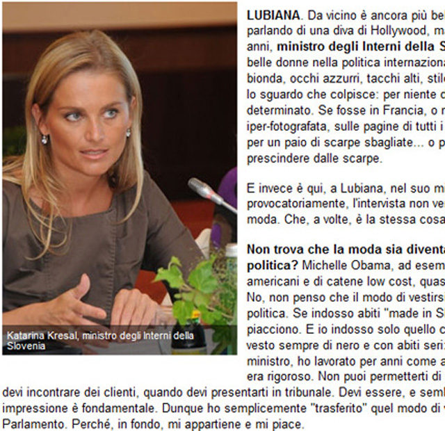 Pri celotnjem članku pa je najbolj zanimiv zadnji del podnaslova: bivša odvetnica, 38 let, vodi slovensko Ministrstvo za notranje zadeve, obožuje modo, se oblači v črno in PRISEGA, DA NIKOLI NE LAŽE. O___o