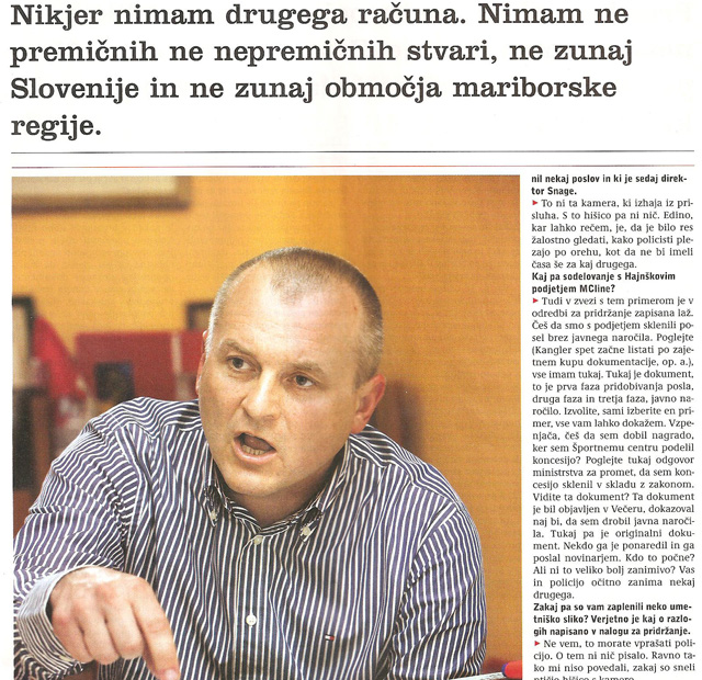 Kangler kot bivši dober policaj,ki je zaprl Wolmajerja,bi moral vedeti,da je lastnik mladine udbovska firma iz Trsta,tudi politika tega časopisa je taka.Glede,na to,da imaš prevelik vpliv na Štajerskem te je treba utišati in odstraniti iz političnega prostora.Kot policaj poišči aferico na dveh nogah,pri avtomobilih je mrzla.Za najdražji uvožen avto na Aston Martin 113.719€ lastnik pasji advokat ni bil plačan DDV kot tudi ne DMV v višini 14.783€ j.Davčni urad Ljubljana je že leta 2006 vložil kazensko ovadbo na Okrožno državno tožilstvo v Ljubljani.Vprašaj kaj je je s to zadevo.Končni kupec je bil pasji advokat partner Aferice na dveh nogah in ministrica za notranje zadeve banana republike.Ugotovljeno je,da so bile pri prodaji tega in še ostalih štirih avtomobilov vmešane firme(missing traderji)neplačujoče firme,ki so kupovale avtomobile in tudi tega za končnega kupca,ki je tudi odgovoren za plačilo davkov,v tem primeru pasji advokat.V tem in drugih primerih,ko gre za pomembne in vplivne ljudi pravna država pri nas ne deluje.V tvojem primeru deluje 100 na uro,ker je to interes iz ozadja.Igralci iz ozadja so tile,ki sem ti jih navrgel.