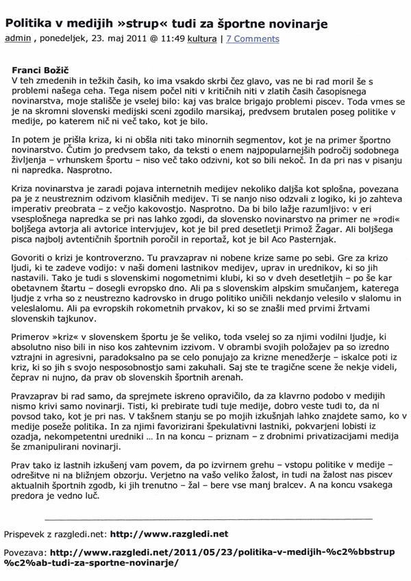 Vprašanje, če bi se Božič podobno izrazil tudi, če bi bil še v rednem delovnem razmerju. Zagotovo ne...Podobno je bilo z Adrijano Starina Kosem. Začela je pljuvati po Janši, ne takrat, ko je delala z njim in pod njim, pač pa tedaj, ko ni bila več odvisna od njega. Ko ga je že vlekla Bošku Šrotu...Kdor kljubuje sistemu, pljuje v lastno skledo. Takih junakov je zelo malo, ker v tem boju z mlini na veter lahko vsak le izgubi. Franci Božič pač nima kaj izgubiti, zato je le povedal tisto, kar mu je ležalo na duši že zelo dolgo, a prej tega ni upal obelodaniti. Ker bi lahko letel na cesto...